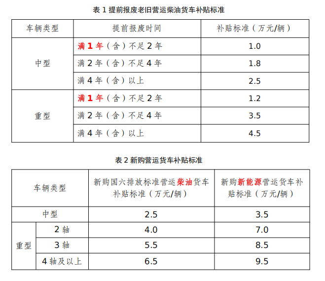 1.提前報廢老舊營運柴油貨車補貼標(biāo)準(zhǔn)見表 1。2.提前報廢老舊營運貨車,并新購營運貨車補貼標(biāo)準(zhǔn)按以下方法計算:報廢并新購國六排放標(biāo)準(zhǔn)營運柴油貨車補貼=提前報廢老舊營運柴油貨車補貼+新購國六排放標(biāo)準(zhǔn)營運柴油貨車補貼報廢并新購新能源貨車補貼=提前報廢老舊營運柴油貨車補貼+新購新能源營運貨車補貼其中,新購國六排放標(biāo)準(zhǔn)營運柴油貨車或新能源營運貨車補貼標(biāo)準(zhǔn)見表 2。3.僅新購新能源城市冷鏈配送貨車補貼標(biāo)準(zhǔn)為 3.5 萬元/輛。
